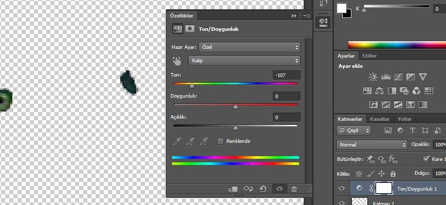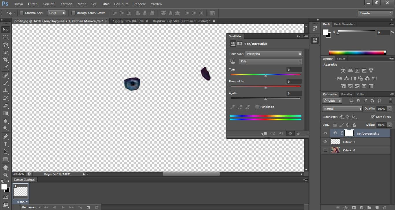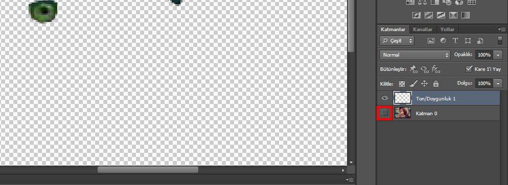 Bu aşamada sadece seçtiğimiz gözlerin kaldı. Bu gözler üzerine Hue/Saturation yani Ton/Doygunluk diyagramını açıyoruz.