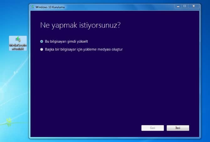 İnen yükseltme paketini çalıştırdığınızda karşınıza aşağıdaki pencere gelecek. Burada zaten "Bu bilgisayarı şimdi yükselt" seçeneği işaretli geliyor. Windows 10 yükseltme işlemini "İleri" diyerek başlatabilirsiniz.