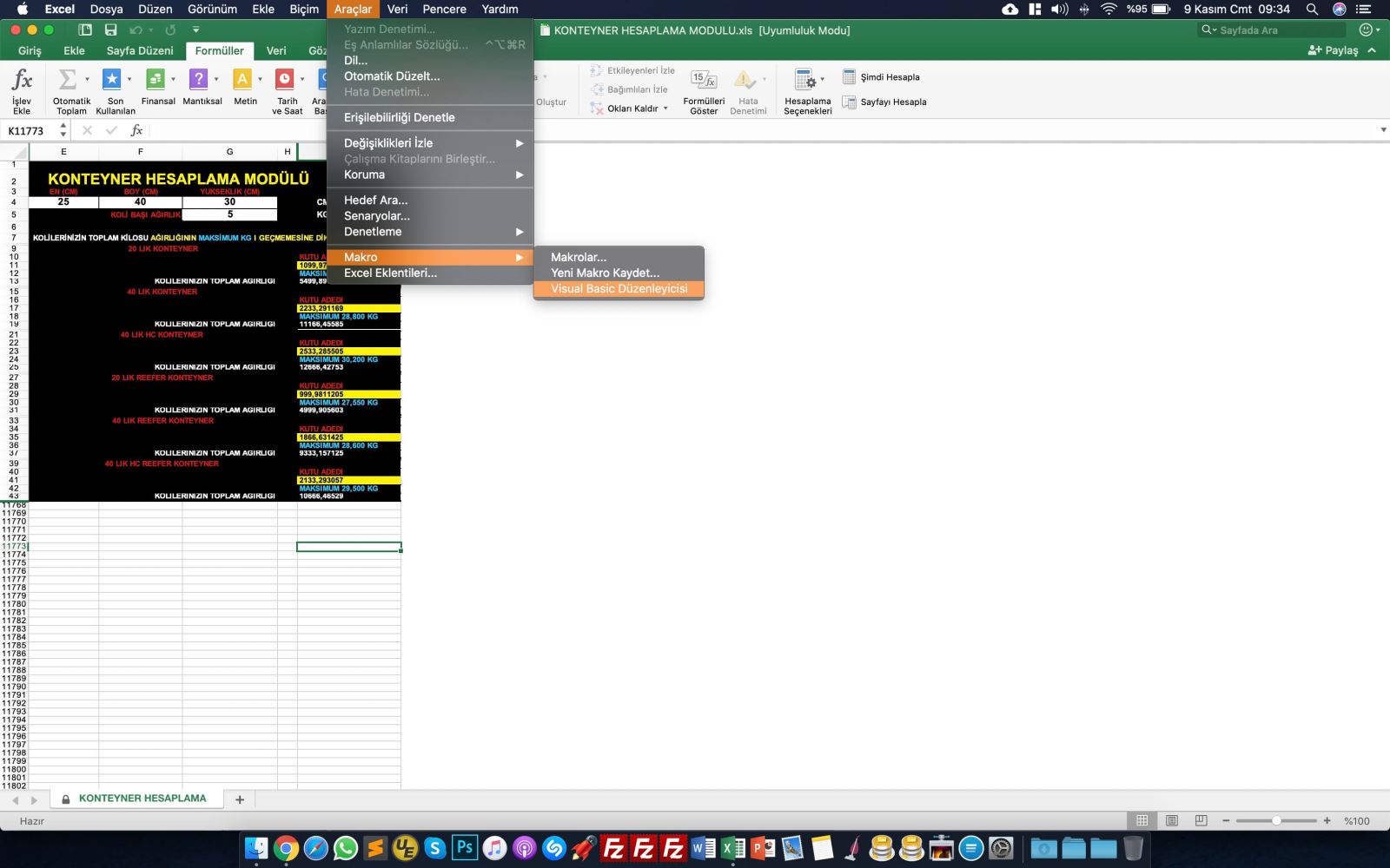 2. Önce Alt+F11 tuşlarına basarak yada Geliştirici sekmesinden Visual Basic bölümüne tıklayarak Excel dosyalarında kod yazabileceğimiz ekranı açıyoruz. Geliştirici sekmesini açmak için Dosya ::bitis:: Seçenekler ::bitis:: Şeridi Özelleştir ::bitis:: Geliştirici bölümünün yanındaki tüm check işaretlerini işaretlemeliyiz. Eğer bu sekmede yoksa ekran resmindeki gibi mac kullananlar Araçlar ::bitis:: Makro ::bitis:: Visual Basic Düzenleyicisi sekmesinden ulaşabilirsiniz.