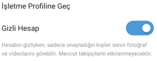 - Hesabımızı Gizli hesap türünden çıkarıyoruz ve bu gizlilik ayarının bir üstünde bulunan işletme hesabına geç butonuna tıklayarak işletme hesabına geçişini yapıyoruz.